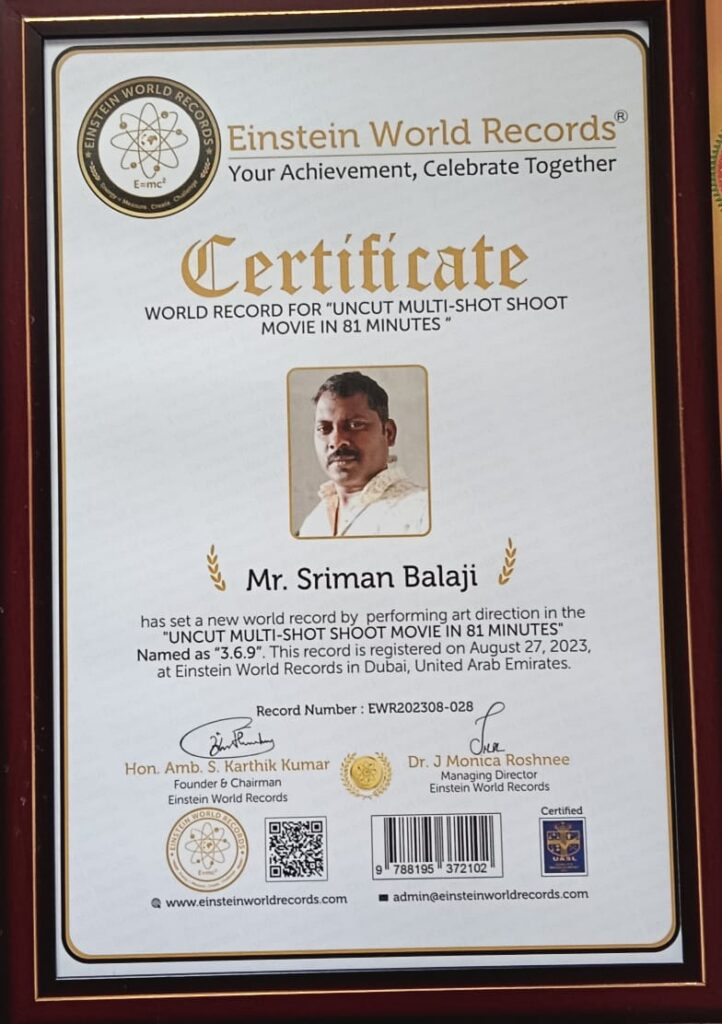 நடிகர் சரத்குமாரின் மாறுபட்ட நடிப்பில் உருவாகி வரும் ‘சமரன்’ படத்தின் கலை இயக் குநர் ஸ்ரீமன் பாலாஜிக்கு கிடைத்த பெருமை மிக்க ‘ஐன்ஸ்டீன் வேர்ல்டு ரெக்கார்ட்’ வி ருது!