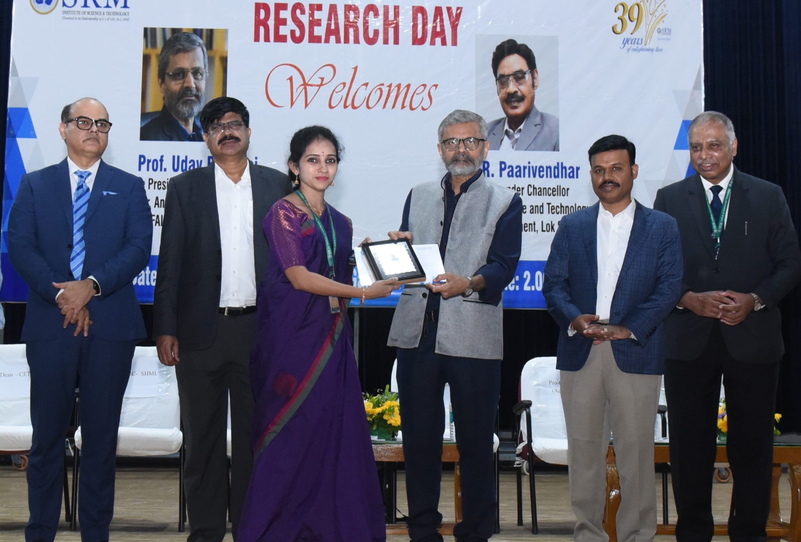 PRIZES: Dr. P. Sathyaranayan, Pro-Chancellor (Academics), SRM Institute of Science and Technology, felicitating a research scholar for publishing her paper in Nature Indexed Journal during the 13th Research Day celebrations at SRMIST, Kattankulathur on Monday. Dr. Uday B.Desai, Vice President, Indian National Academy of Engineering and Chancellor, ICFAI( Institute of Chartered Financial Analysts of India), Dehradun, and Chancellor, Anurag University, Hyderabad, is also present.