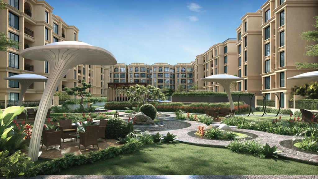 At the core of Casa grand Casa mia lies a s prawling 2-acre tropical forest, thoughtfully designed to offer a serene and immersive li ving experience. Lush with teak plantations, fruit orchards, themed gar dens, forest trail s, and mini woodlands, this green heart of t he community create s a peaceful retreat a midst the vibrancy of city life. Surrounding this is 14.9 acres of expansive open space and five exclusi ve themed courtyards spre ad across 8 a cres, including a 3-acre “Moth er Earth” z one, a celebration of nature wov en into the fabric of everyday living. Comple menting the community’s verdant charact er is a 1.5-acre Spanish-styled clubhouse, exu ding grandeur and elegance, which overloo ks a grand podium and two 13,0 00 sq.ft. s wimming pools.