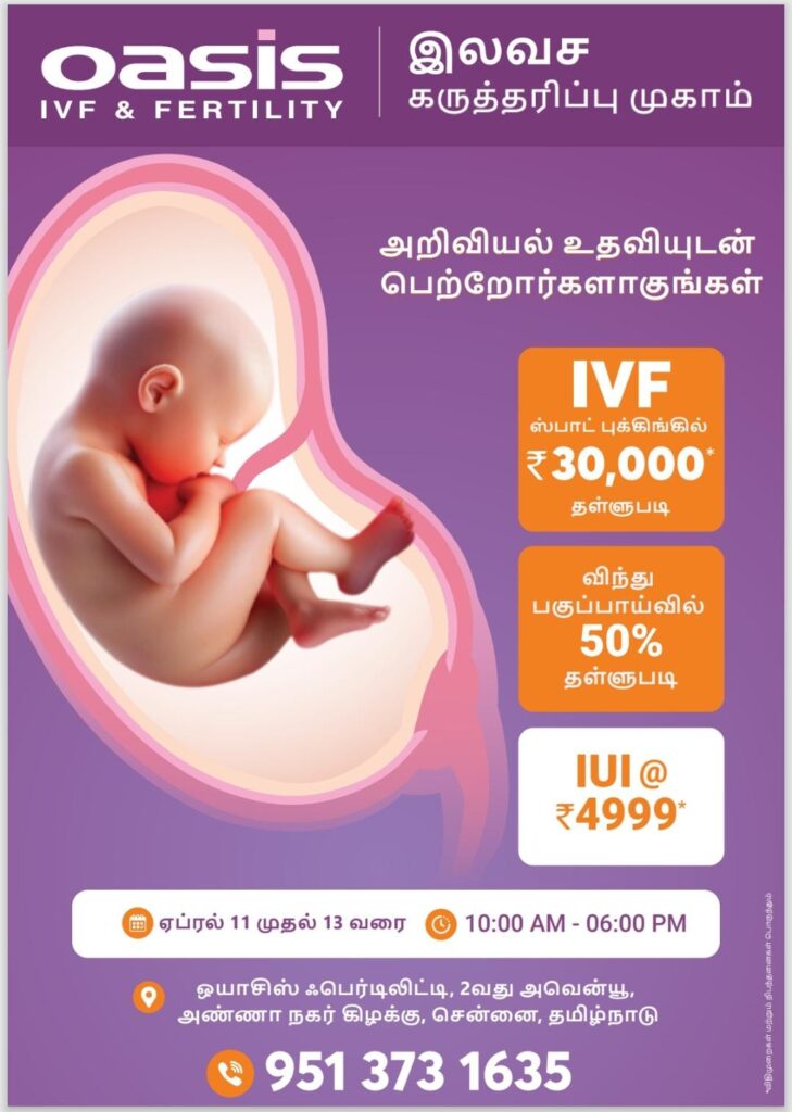 Chennai, 11 April, 2025: In a heartfelt efort to support aspiring parents in their j ourney toward parenthood, Oasis Fertil lity will be organizing a Free Fertility Ca amp across Ta mil Nadu from April 11th to 13th, 2025, bet ween 10:00 AM and 6 :00 PM at Oasis Fertil ity, 2nd Avenue, A nna Nagar East, Chennai.