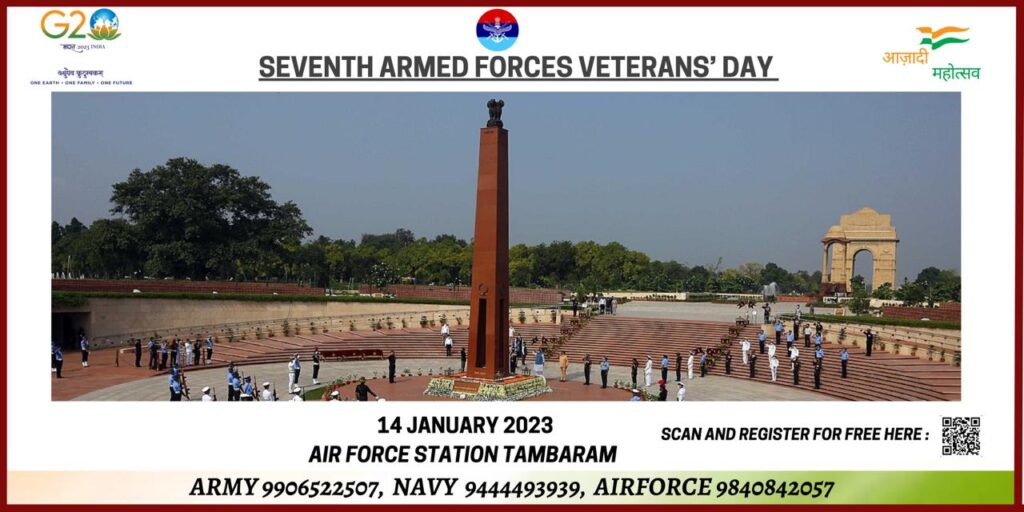 The First Armed Forces Veterans Day was celebrated in 2016 wherein, it was decided to commemor ate this very day every year, by hosting such interactive events in the honour of our Armed Forces Ve terans and their families. Seventh Armed Forces Veterans Day will be celebrated on 14th January 20 23 at Air Force Station, Tambaram. Events are being organized across the country by Three Service Headquarters at various cities apart from one main event presided over by Hon’ble Defence Minist er of India. Veterans may reach to the respective Sainik Boards for participation.
