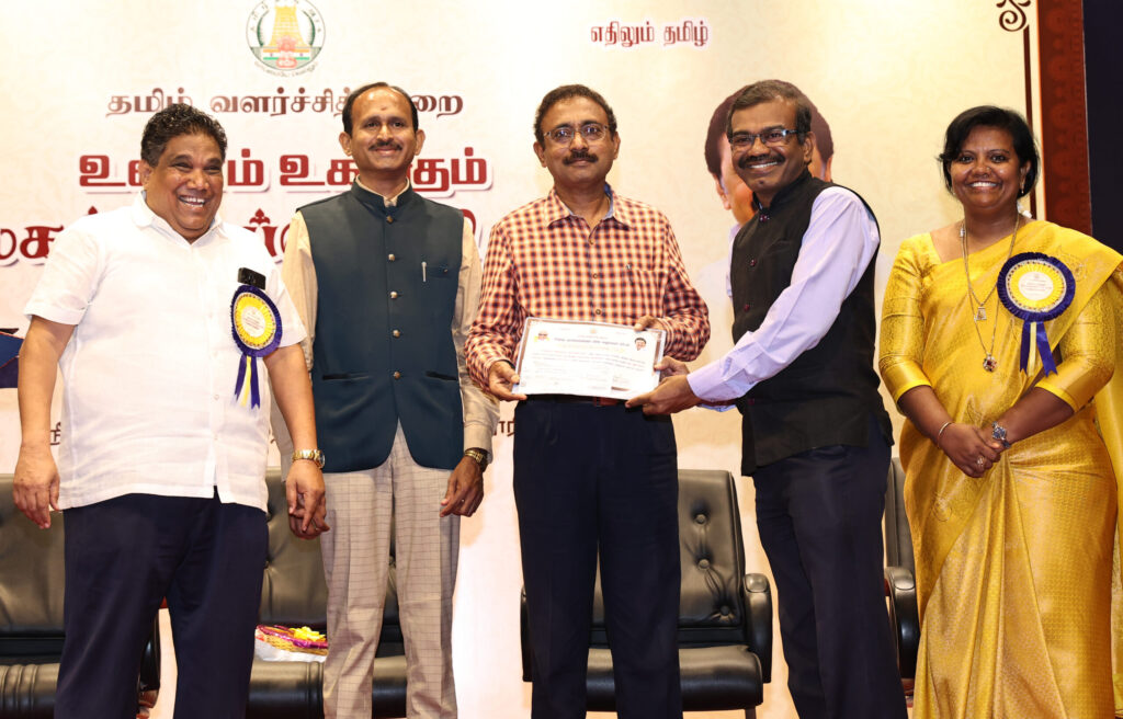 This Award was presented to him by the TN Govt Secretary for the Department of Tamil Development and New s, Dr. R. Selvarasu IAS recently (on 21st February 2023) on the occasion of World Mother Tongue Day celebratio ns held at SIET College, Chennai.