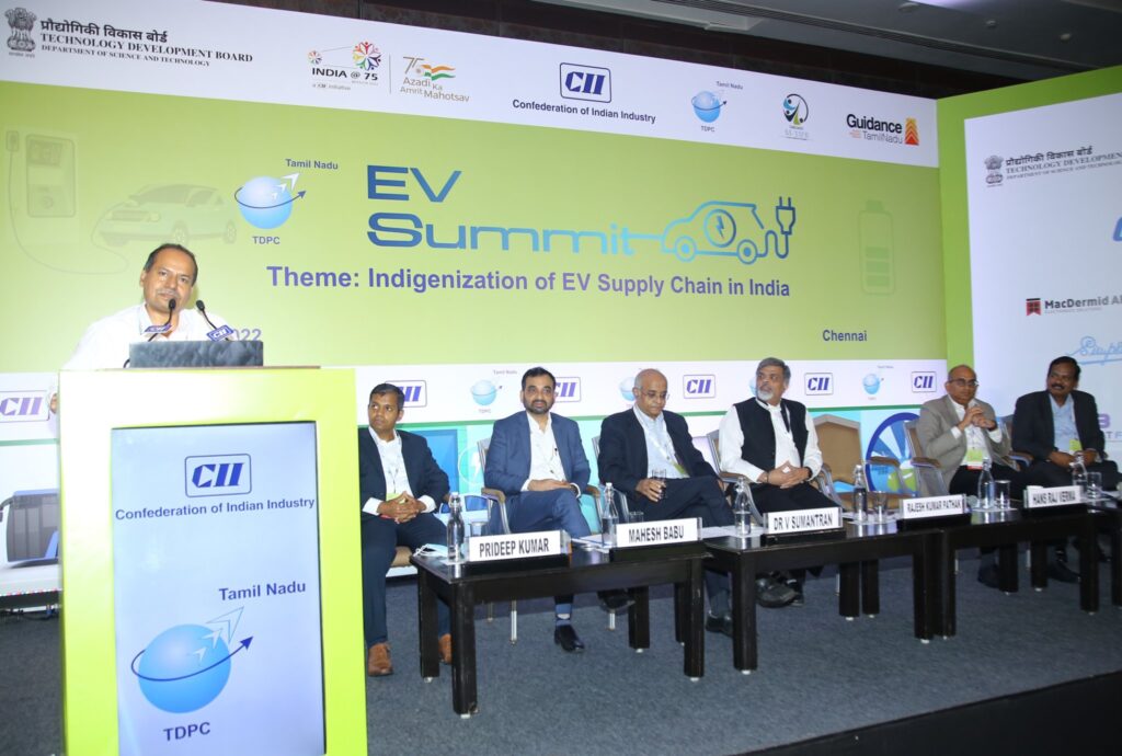 Chennai, 24th June 2022, “The Hon’ble Chief Minister of Tamil Nadu has a vision to make Tamil Nadu a $1 Trillion econo my by 2030 and this can be made possible with the much-needed EV push. Tamil Nadu is a very vibrant economy and Ch ennai is the EV Capital of India apart from being called the Detroit of Asia. The Government welcomes EV companies to set shop and we are willing to assist them in every possible way”, said Mr Hans Raj Verma, IAS, Chairman & Managing Director, Tamil Nadu Industrial Investment Corporation Ltd, Government of Tamil Nadu at the EV Summit 2022 org ani sed by the Tamil Nadu Technology Development & Promotion Centre of Confederation of Indian Industry (CII) with the theme “Indigenization of EV Supply Chain in India” here today.