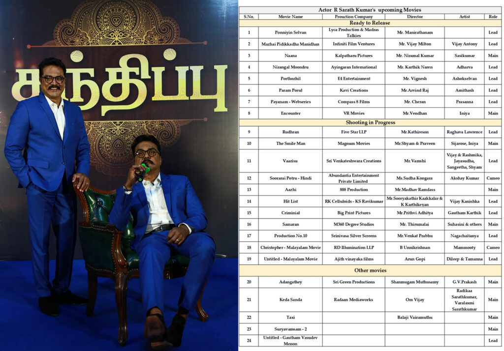 It’s been a great delighting experience working with Mani Ratnam sir says Supreme Star Sarath Kumar Filmma ker Mani Ratnam, one of the most-celebrated filmmakers in Indian film industry, has created the epic ‘Ponniyin Selvan’ with an ensemble star-cast. With the movie all set for worldwide theatrical release on September 30, 2022, actor Sarath Kumar, who plays the role of Periya Pazhavettaraiyar, met and interacted with the press and media fraternity today.