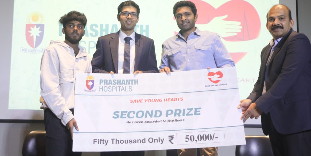 Addressing the audience on the significance of being aware and alert of cardiac wellness, Senior Cardiologist, Dr. Kathiresan commented “The healthy lifestyle changes should be imbibed right from the school. There should be a continuous campaign for the public by professional organisations and the government. Long term environm ental changes are also needed. We must immediately seek medical help when we face even the slightest signs an d symptoms of cardiac complications like a heart burn, radiating pain in hands and shoulders, and a sense of disc omfort in the heart or breathing. “Prashanth Hospitals’ ‘Save Young Hearts’ digital campaign reached out to a w ide audience across various social media platforms, empowering young individuals to take proactive steps in pr eventing cardiac complications. Given the growing concern of heart disease among the younger generation, the campaign’s mission was to educate, inspire change, and drive the importance of heart health through innovative social media initiatives. The Grand Finale of this campaign was organized at Crest Club, Phoenix Marketcity, Che nnai. The “Save Young Hearts Reels Contest” served as a platform for open discussions, creative engagement, a nd debates focused on preventing the increasing incidents of heart attacks.