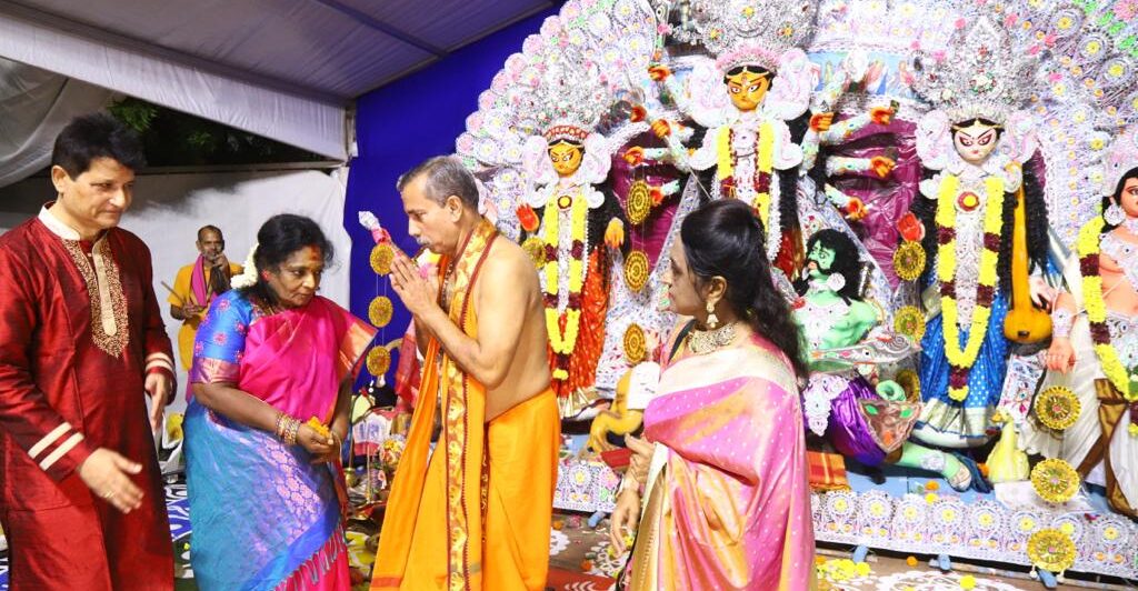 The Inaugural of Durga Pooja, the event titled, Sharadtsav’ 23 was flagged off by the Hon. Governor, Smt. Tham izhisai Soundarrajan, today, Saturday, 21st October at Kailash Convention Centre, Injambakkam on ECR. The ho nourable Governor first offered her prayers to Goddess Durga.